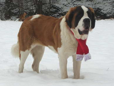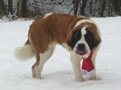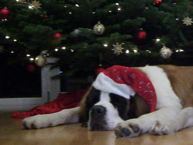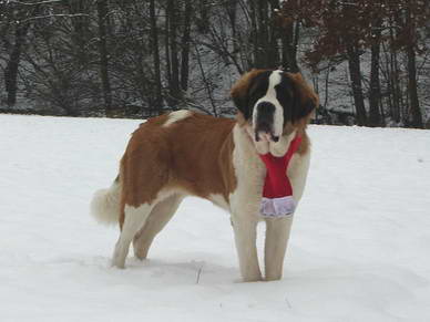 Mit ihrem von Frauchen genähtem Schal hatten die Passanten doppelte Freude... Den langersehnten Schnee... und einen Weihnachtsbernhardiner :o)