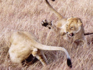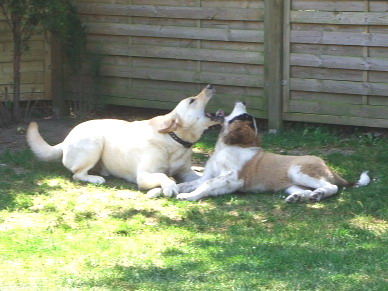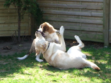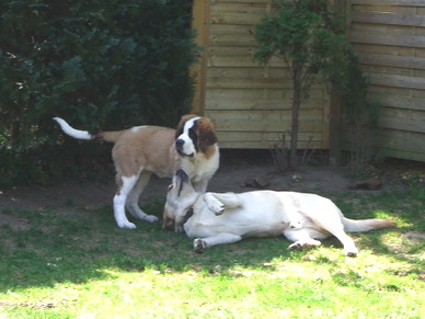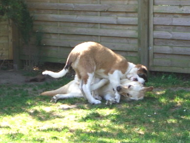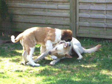 Von zärtlichem Spiel kann man hier wohl kaum sprechen. Nemo beißt Navy ins Bein, während sie ihm das Ohr abkaut :o)
