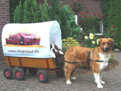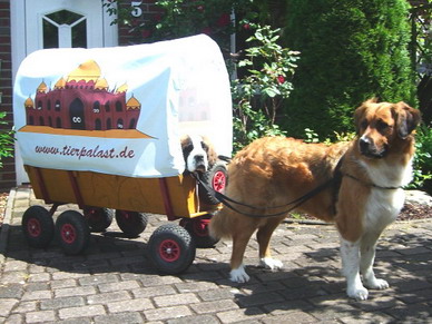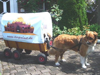 Bild von Ylvi, Navy und dem Bollerwagen. Erst schaut Ylvi